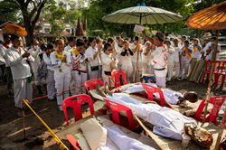 ![]() A human skull is cleaned in a bucket of water by a team of Thai Buddhist volunteers during the Lang Pacha ritual at Visutmakhiri Cemetery, Saraburi, Thailand. | ![]() Buddhist volunteers dressed in white are seen resting beside a human skeleton during the Lang Pacha ritual at Visutmakhiri Cemetery, Saraburi, Thailand. | ![]() Thai Buddhist volunteers pray to the mummified human remains decorated in gold leaf during the Lang Pacha ritual at Visutmakhiri Cemetery, Saraburi, Thailand. Mummified remains are perceived as magical and can give blessing to the participants. |